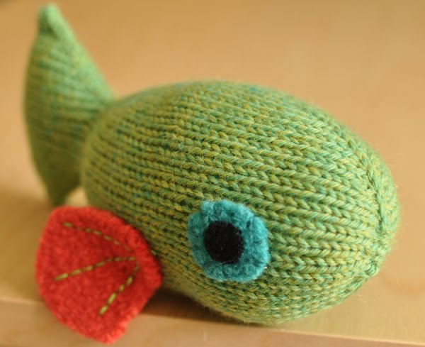 The centre front of this little fish is fashioned exactly the way you'd create a sock toe and the rest of his body is an improvised set of stitch increases and decreases. The eyes and fins are cut from wool felt that I made by knitting swatches of wool yarn and washing the heck out of them in hot, soapy water.